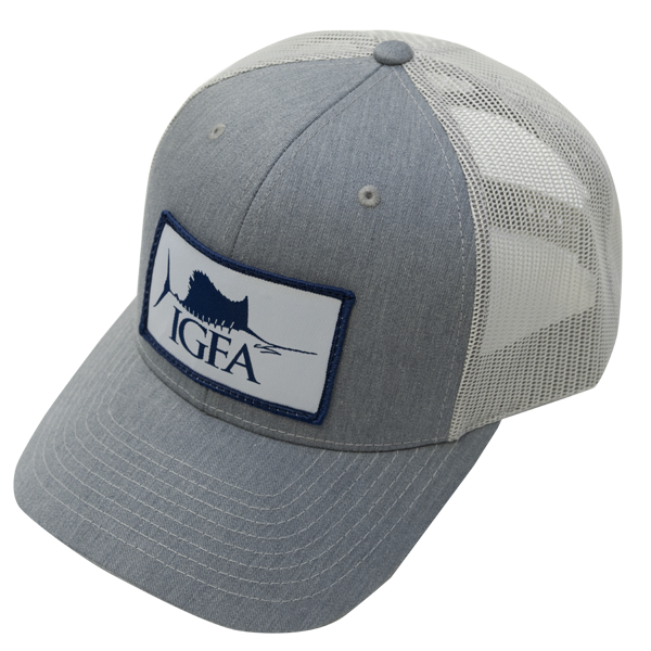 This Richardson 112 snapback hat features the white and navy IGFA sailfish logo patch. The front is a classic heather gray, paired with off-white mesh back for breathability and comfort.